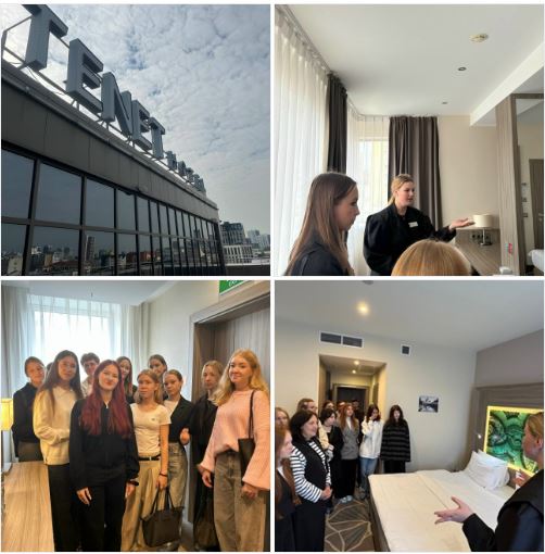Конечно, встречала нас улыбкой наша выпускница 2022 специальности Гостиничный сервис менеджер зала Минязева Александра. Работают в отеле выпускники специальности Гостиничное дело 2025 года Казанцева Аня и Бобыкина Аня. И сейчас студенты группы 4ГД проходят практику в отеле «TENET» и за их работой студенты смогли тоже пронаблюдать, примерив на себя роль практиканта. Экскурсия всем очень понравилась и мы делимся впечатлениями.