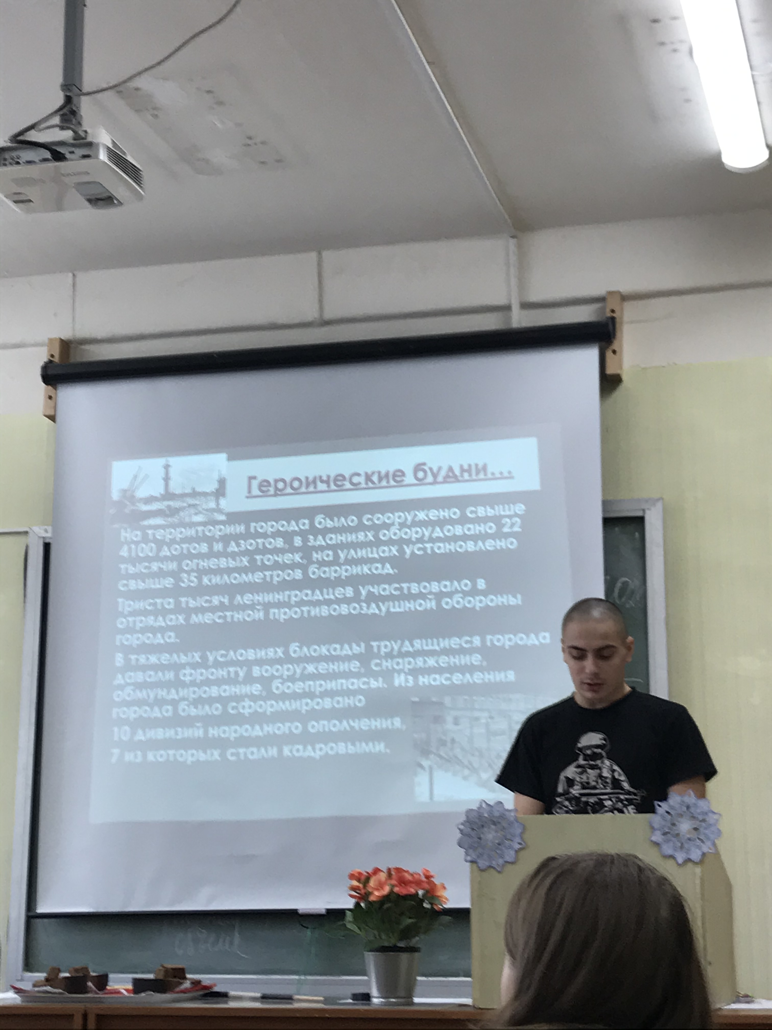 Емкое сообщение сделал Мкоян Артем «Героические будни Ленинграда». В заключении мероприятия была проведена акция «Блокадный хлеб» и Минута молчания.