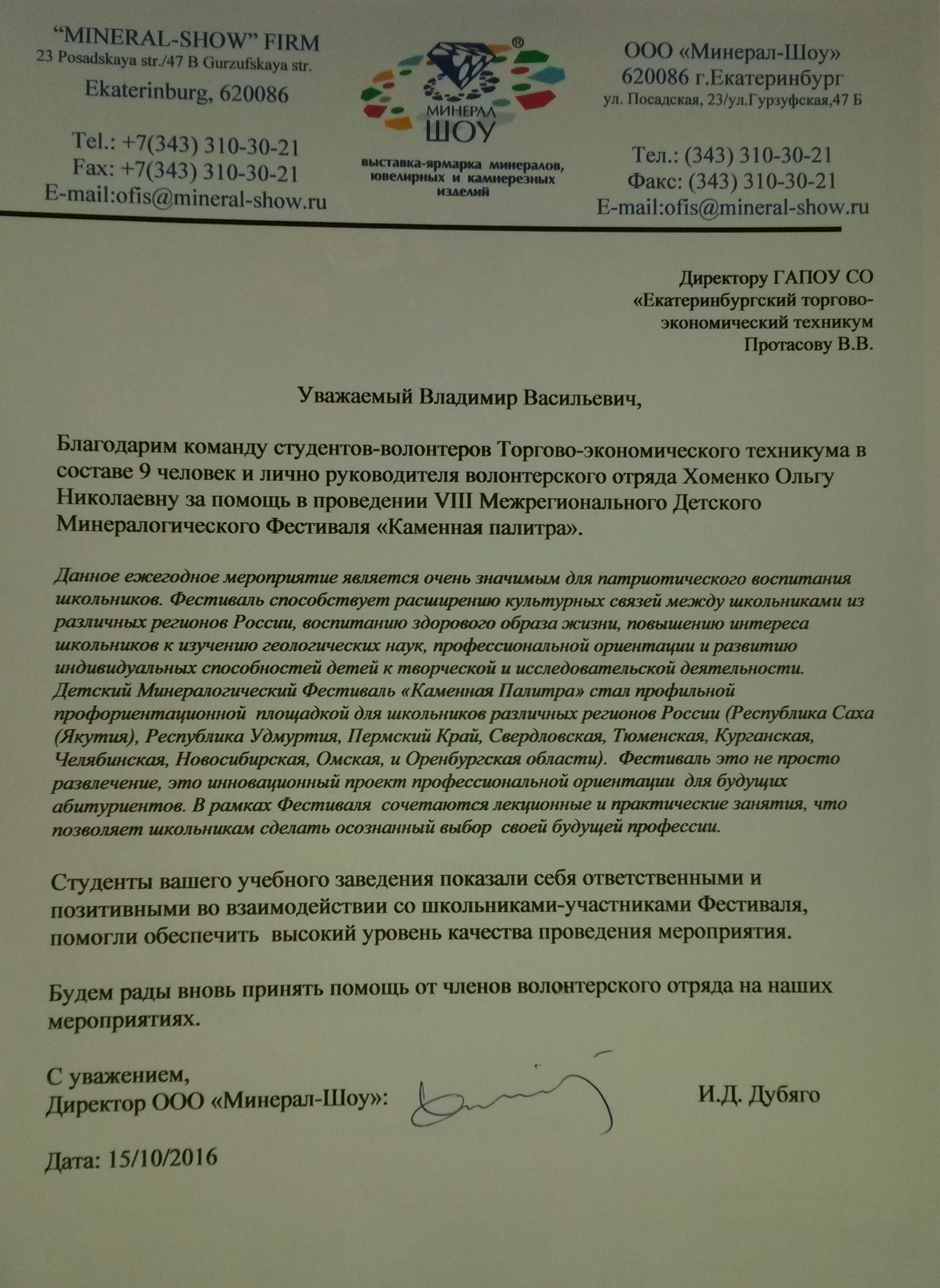 В октябре студенты техникума приняли активное участие в работе по организации VIII Межрегионального Детского Минералогического Фестивале «Каменная палитра».http://mineral-show.ru/