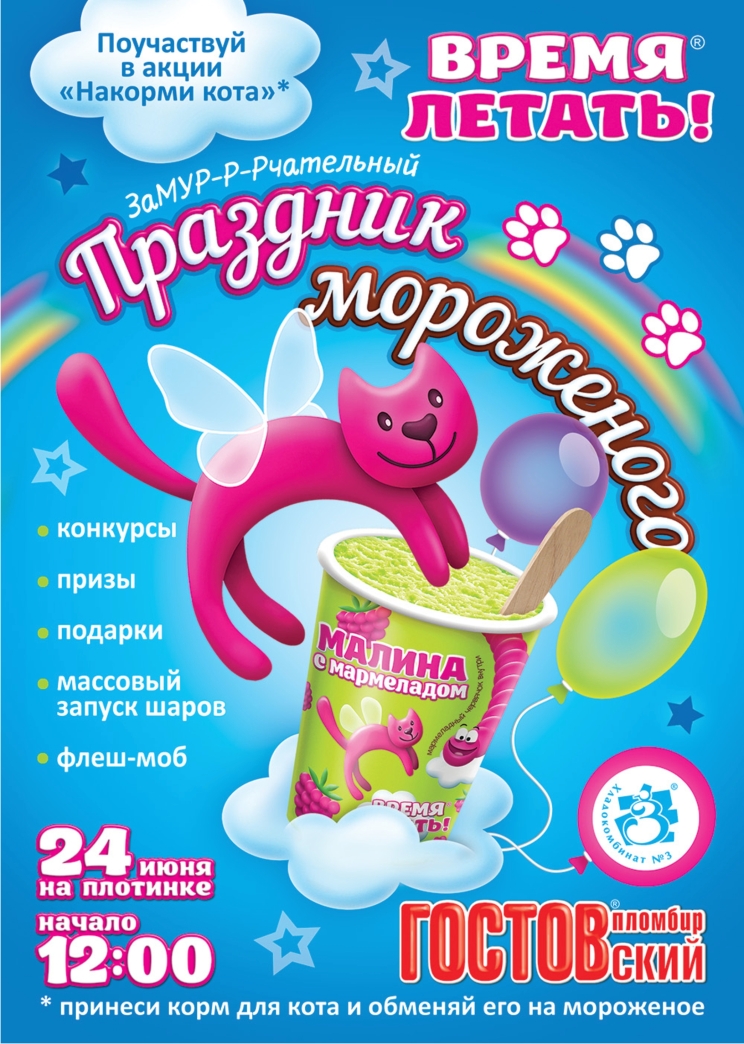 Мороженое «ВРЕМЯ ЛЕТАТЬ» такое вкусное и необычное, что даже кошки летают от удовольствия. Хладокомбинат №3 собирает выставку летающих котов! Создайте с ребенком поделку летающей кошечки, изображенной на упаковке мороженого «ВРЕМЯ ЛЕТАТЬ». Приносите на Праздник Мороженого, обменивайте поделку на вкусное, необычное, яркое лакомство. Фантазируйте, импровизируйте!