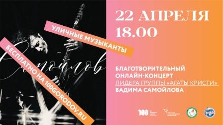 Легенда русского рока Вадим Самойлов (экс-«Агата Кристи») выступит с благотворительным онлайн-концертом в рамках акции «Уличные музыканты». Собранные средства будут направлены в детский фонд «Мы вместе». В программу войдут хиты и новые песни. Любой зритель во время концерта сможет сделать добровольное пожертвование. Эти деньги будут направлены на помощь тяжелобольным детям.
