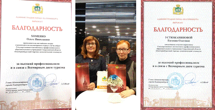 Устюжанинова Евгения Олеговна (преподаватель специальности «Гостиничный сервис») и Хоменко Ольга Николаевна (преподаватель английского языка) получили Благодарность из рук Сергея Тушина, заместителя главы Администрации Екатеринбурга по организации значимых общероссийских и международных мероприятий.