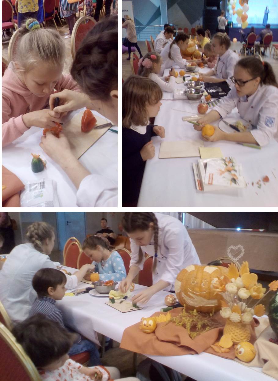 Студенты техникума (под руководством преподавателя Татьяны Геннадьевны Новоселовой) провели мастер-класс по художественной нарезке из овощей и фруктов. Дети очень старались, с огромным удовольствием вырезали разных зверушек: кошечек, собачек, лягушек и цветы из апельсинов, яблок, огурцов, моркови. Все поделки довольные ребята унесли с собой. А сладкую композицию - Лунтика из арбуза - в конце праздника разрезали на кусочки и съели.