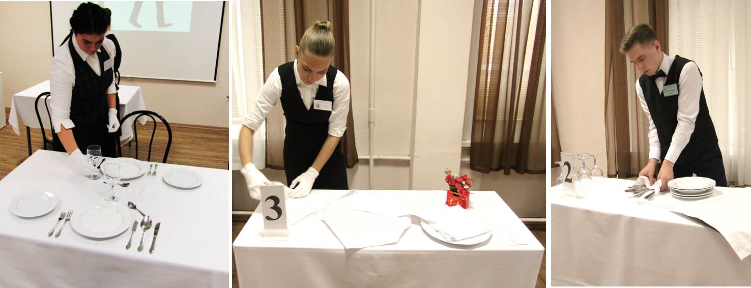 Практическая часть была представлена, в соответствии с компетенциями WorldSkills: нужно было продемонстрировать стол-бокс, предварительную сервировку стола (по индивидуальному заданию), складывание салфеток 10 различными способами, а также обосновать выбранные элементы сервировки, ответить на вопросы экспертов.