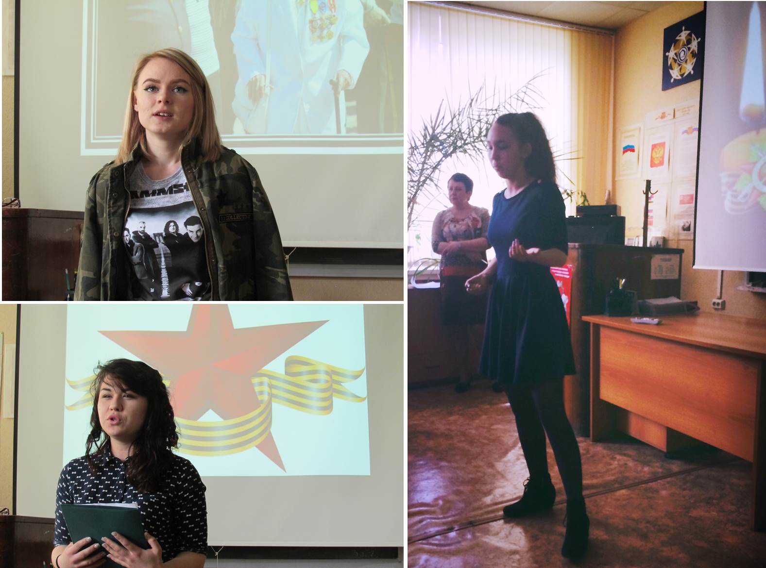 В цикловой комиссии общеобразовательных дисциплин и иностранного языка 16.05.2017 состоялось мероприятие, посвящённое Дню Победы, в котором принимали участие студенты первых и вторых курсов.