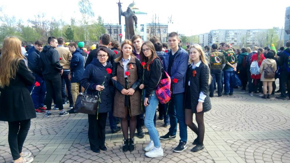 И, конечно, наш техникум принял участие в митинге. Студенты группы 1Т-1 несли вахту памяти и раздавали георгиевские ленточки всем пришедшим на митинг. А студенты группы 1К-2 с преподавателем Рябковой Екатериной Валерьевной возлагали цветы к памятнику «Седой Урал».