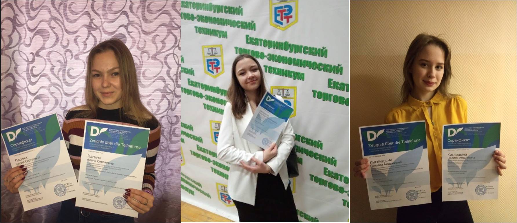Кислицына Полина (2П-1), Овчаренко Александра (1П-1) и Пагина Алёна (1Бт-11) приняли участие в Международном конкурсе творческих работ в жанре эссе «История в биографиях» (Der internationale Wettbewerb "Geschichte in Biografien"). Организаторами конкурса выступили Екатеринбург (Россия), Казань (Россия, республика Татарстан) и Штутгарт (Германия). Полина и Александра в своих эссе рассказали истории своих прадедов - участников Великой Отечественной войны. Алена рассказала о своей прабабушке – труженике тыла. На сегодняшний день на конкурс подано более 2000 эссе, раскрывающих истории подвигов героев Великой Отечественной войны.