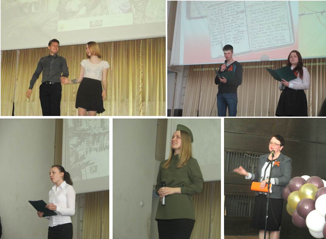 Под девизом «Все для фронта, все для победы» поднялся русский народ на защиту своей Родины. Так вот и наши ребята открыли мероприятие стихотворением «Вставай страна огромная…» на английском и русском языках. Далее прозвучали строки из песни Владимира Высоцкого «Только он не вернулся из боя…». О таких же ребятах, как и сами студенты, совсем юных мальчишках и девчонках были исполнены произведения: Р. Рождественского «Баллада о красках», Юлии Друниной «Зинка», «Дети в Освенциме», «Майор привез мальчишку на лафете» и другие. Осознавая горечь потери родных и муки ожидания возвращения выживших, ребята проникновенно читают на английском языке строки стихотворения «Жди меня, и я вернусь…».