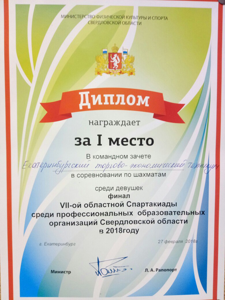 Девчонки тоже не отстают от парней. На соревнованиях по шахматам 28 февраля сборная команда девушек заняла 1 место в финале VII областной Спартакиады среди профессиональных образовательных организаций Свердловской области.