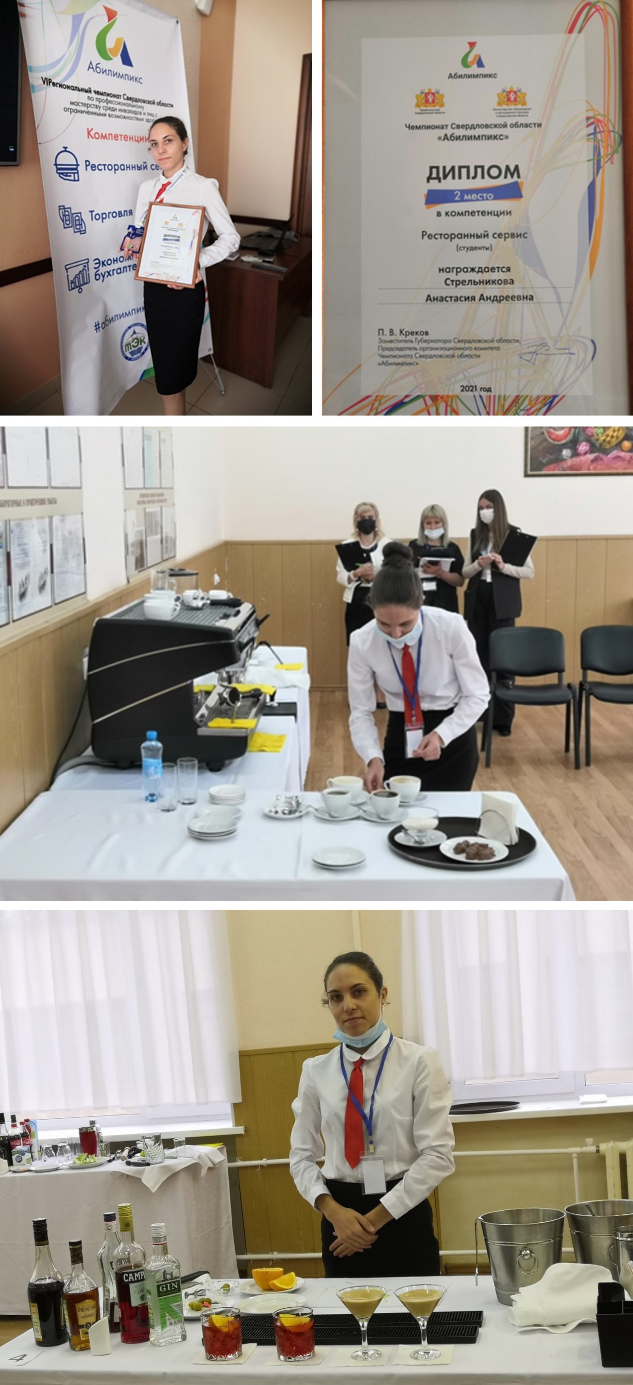 22-23 сентября 2021г., на площадке ГАПОУ СО "Нижнетагильский торгово-экономический колледж" прошел VI Региональный чемпионат профессионального мастерства «Абилимпикс» по Свердловской области. Студентка группы 2Т-11 Стрельникова Анастасия выступала в компетенции «Ресторанный сервис», участие в данном чемпионате для нас было впервые. Ребята соревновались по 4 модулям, они подготавливали рабочее место официанта и гостевую зону для встречи и обслуживания, работали с текстилем, готовили коктейли различными методами и варили кофе для гостей.