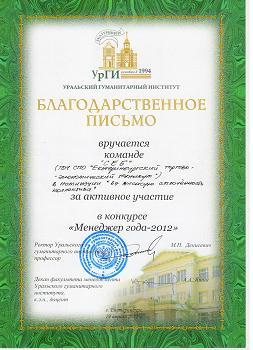 Поздравляем наших ребят, занявших 3 место в конкурсе «Менеджер- 2012 года», который проходил 19.04.2012 в Уральском Гуманитарном Институте