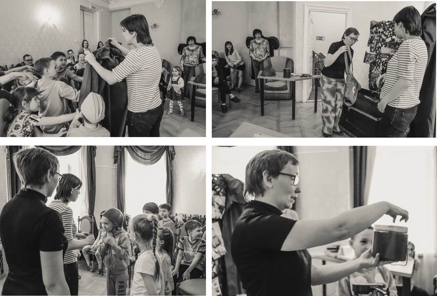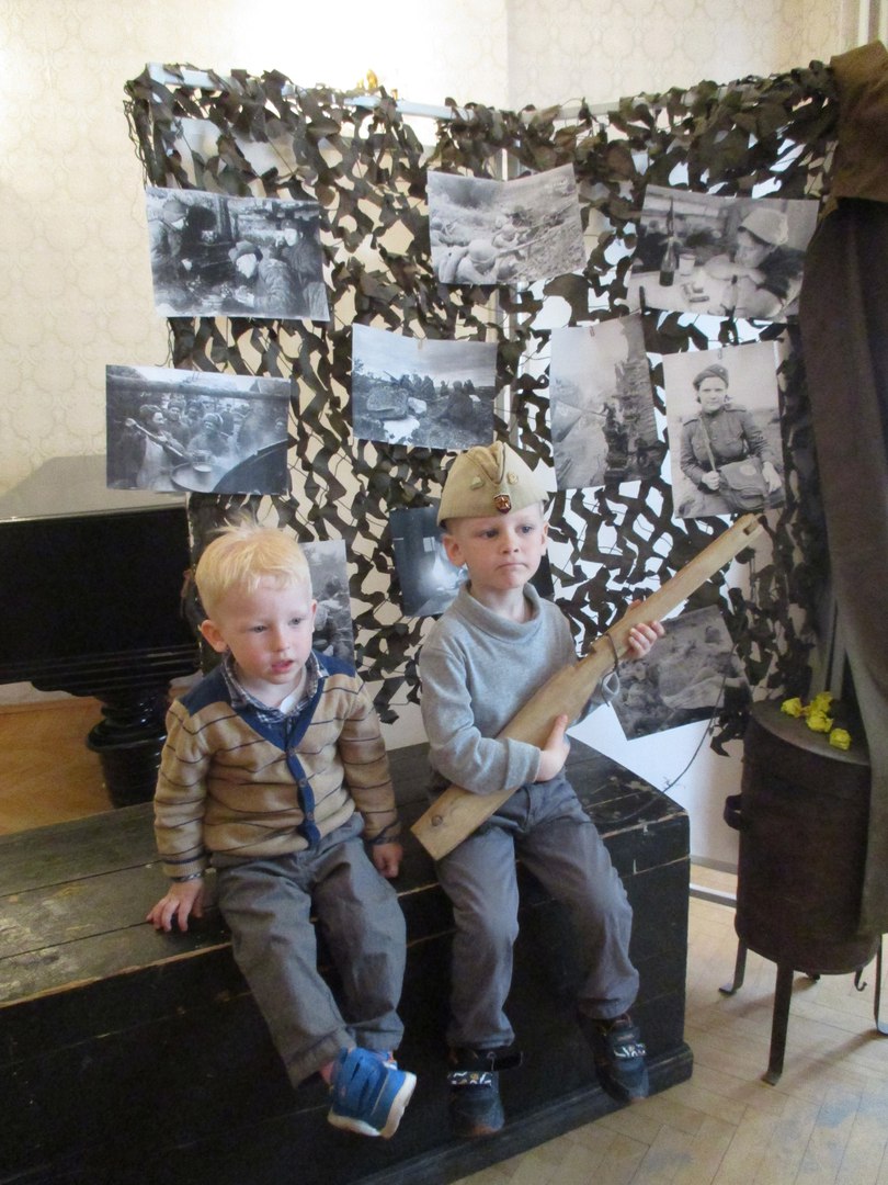 Малышам предстояло преодолеть полосу препятствий, произнести пароль и отыскать с помощью машины времени землянку, попытаться «растопить» буржуйку «угольками» и разгадать загадки: как же без электричества писали письма бойцы? Как не промокнуть под дождем на марше? Что такое солдатский «Сидор»?
