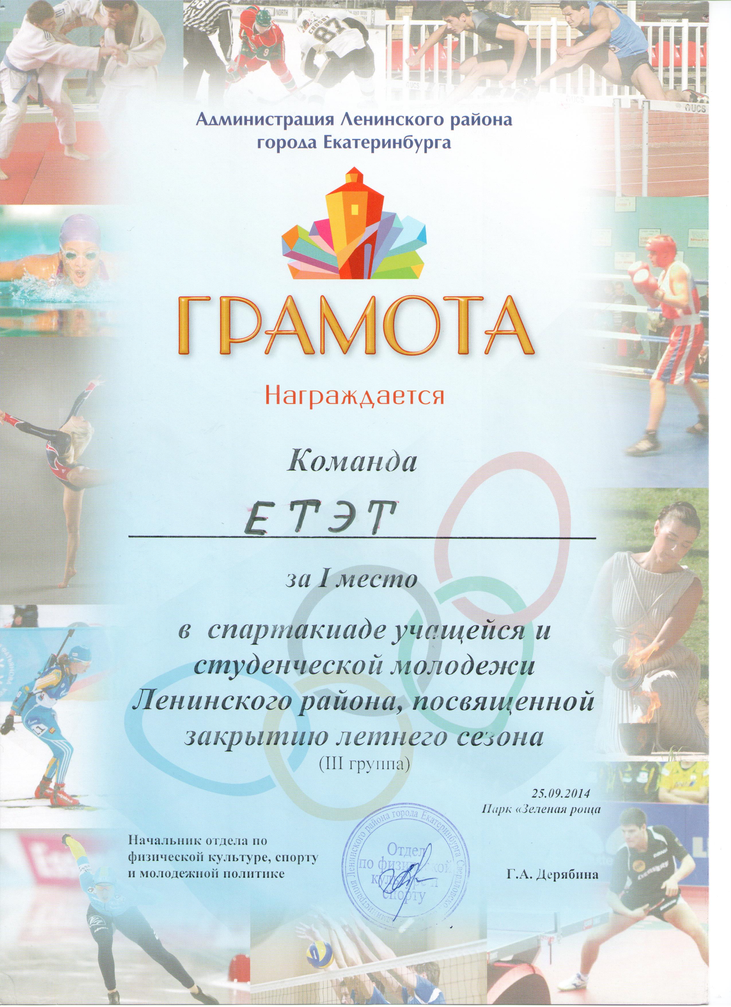 Закончилось лето, а вместе с ним и еще одна спортивная страничка - Летний спортивный сезон. Но закончилась она не просто точкой или унылой запятой, а упрямым гордым восклицательным знаком. Команда ЕТЭТ заняла первое место по Ленинскому району в спартакиаде учащейся и студенческой молодежи!