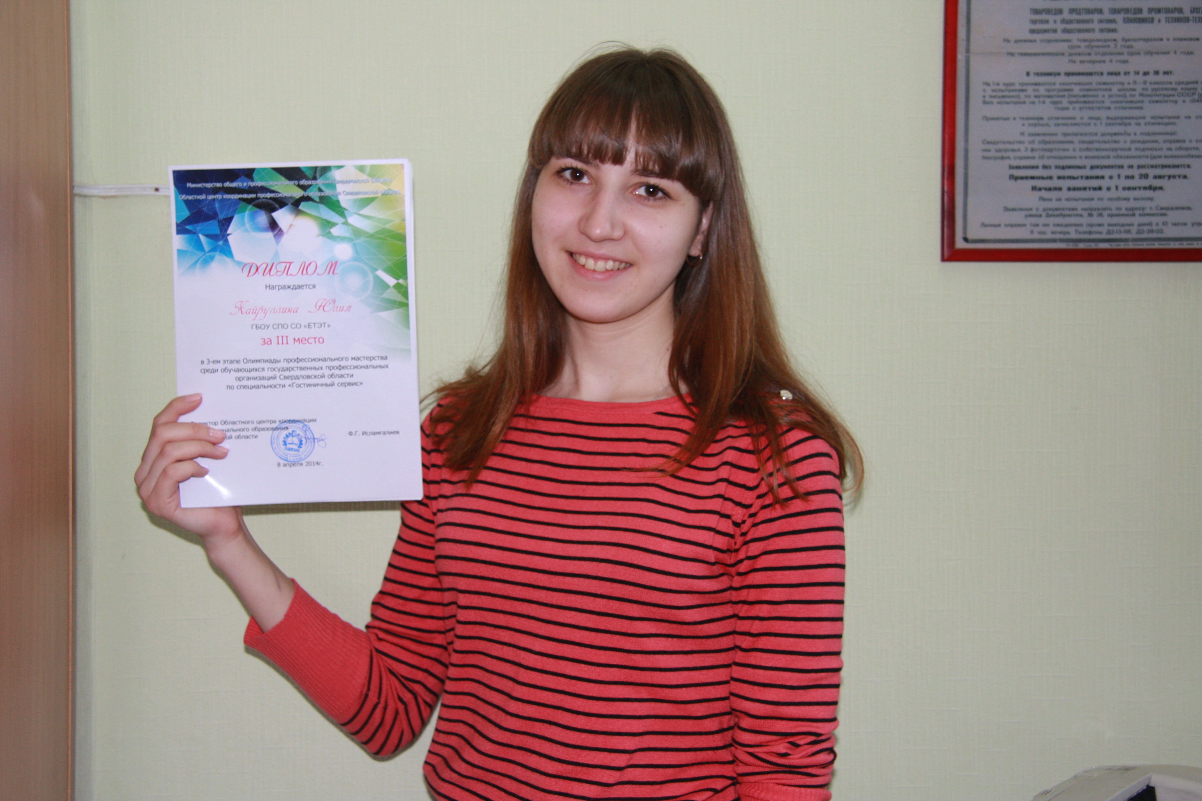 Еще одно призовое место заняла Хайруллина Юлия, студентка специальности «Гостиничный сервис», сотрудница пятизвездочной гостиницы «HYATT».