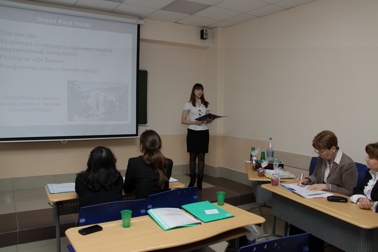 Она показала высокий уровень владения профессиональным материалом на теоретическом этапе, хорошо справилась с практическим заданием: внесение предложения по оборудованию номера 4 категории, а так же представление подготовленного заранее варианта поощрения гостя (на профессиональном сленге это называется «комплимент гостю») за длительное проживание в гостинице. Юлия предложила в качестве комплимента приветственную открытку и карту постоянного гостя, включающую в себя систему скидок и бонусов. Кроме того, необходимо было представить папку гостя, учитывающую потребности участника крупного международного мероприятия, Юлия выбрала в качестве такого мероприятия Международный чемпионат по программированию. Еще одним испытанием стал диалог на английском языке между сотрудником отеля и гостем, Юлии досталась роль специалиста службы бронирования.