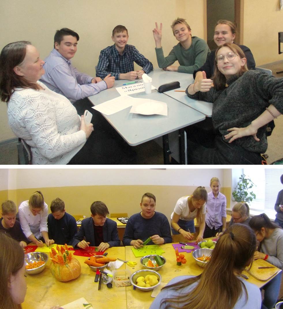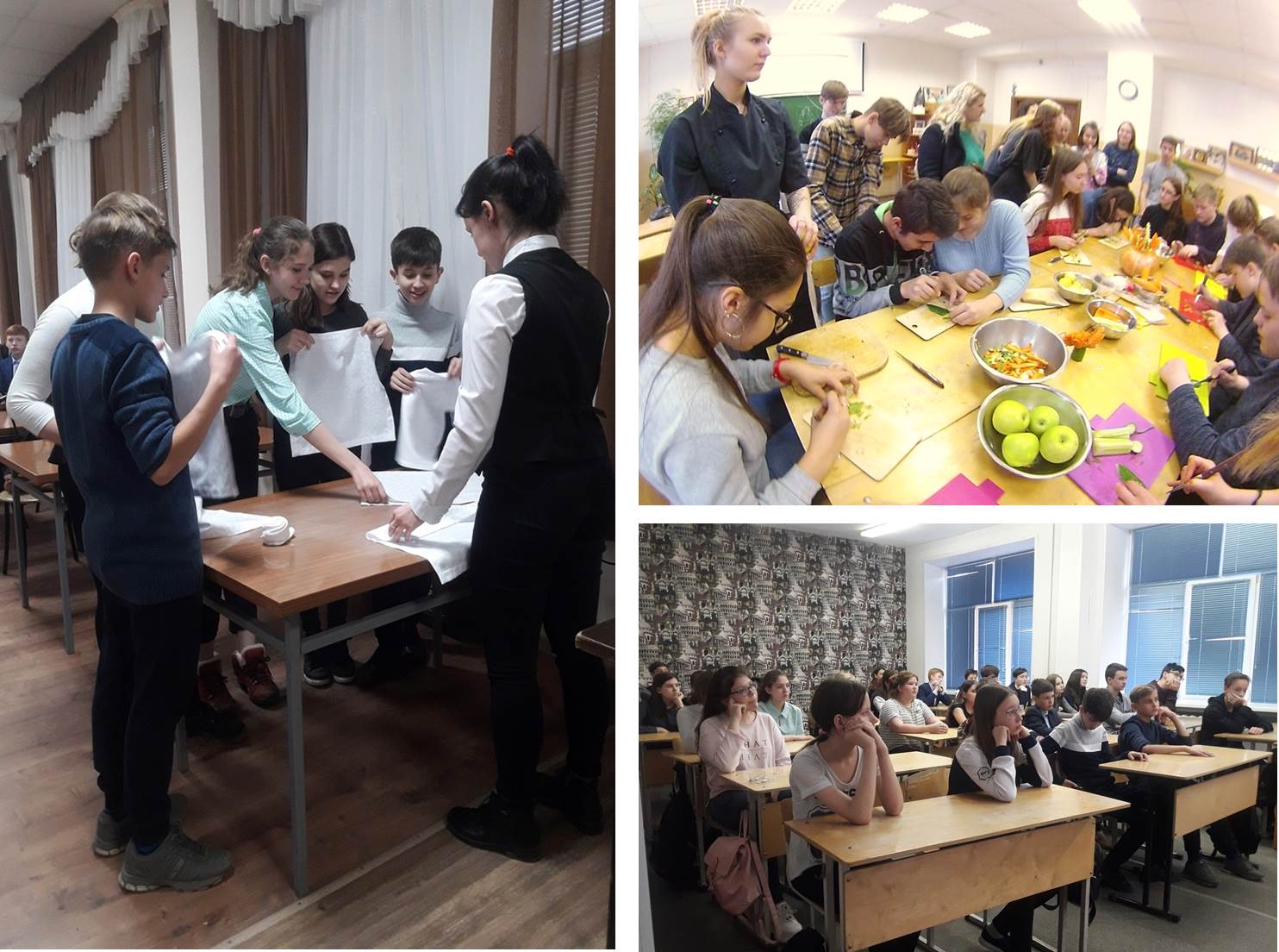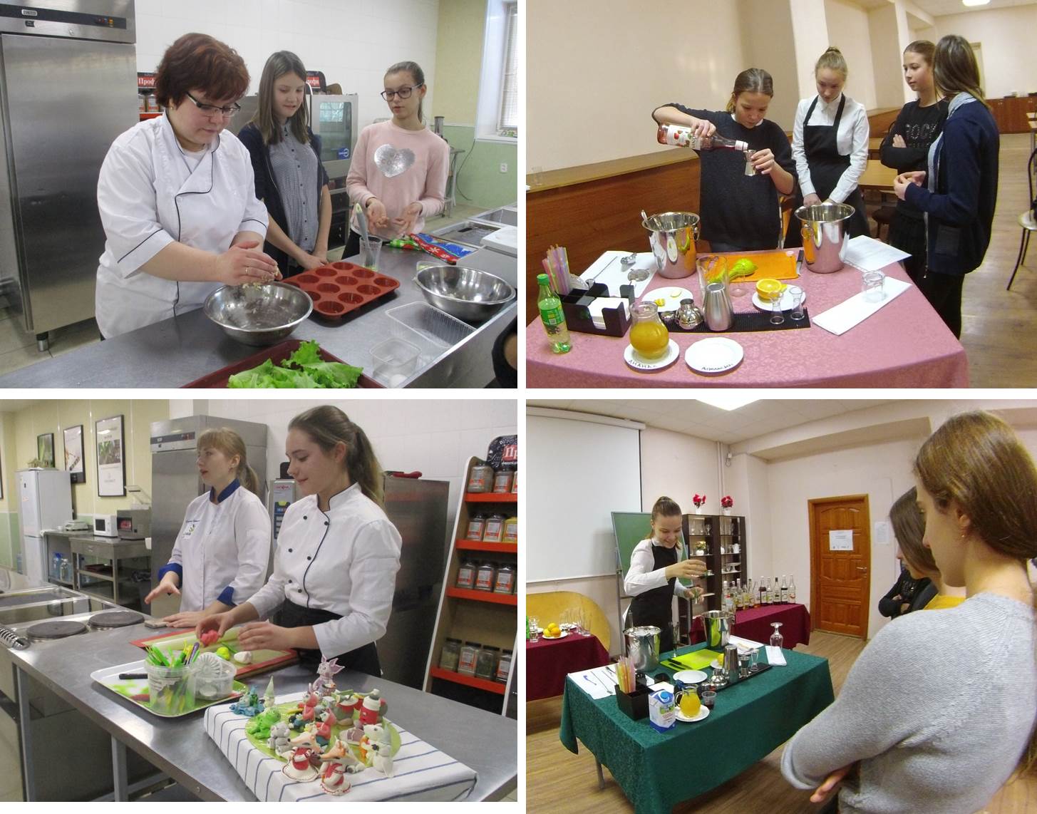 А их у нас в октябре-ноябре было не счесть! География и формат самые разнообразные: от обзорных экскурсий и мастер-классов до профессиональных проб. К нам приезжали школьники из г. Богданович, г. Реж, г. Михайловска. Екатеринбургские ребята приходили в рамках ежегодного профориентационного мероприятия «Профи-дебют» масштаб: город» и проекта «Билет в будущее». Мы старались создать дружескую атмосферу и помочь нашим юным гостям определиться с выбором в жизни. Для этого наши доблестные студенты-технологи под руководством Н.С. Гордеевой, Т.Г. Новоселовой и В.И. Феоктистовой без устали рассказывали и показывали премудрости лепки из мастики, карвинга и приготовления фуршетных закусок.