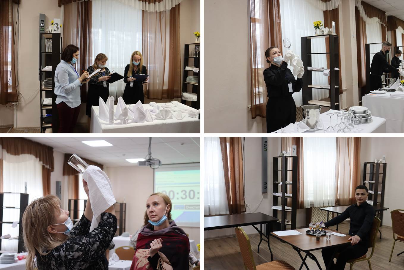 - участникам предстояло показать свое мастерство в складывании текстильных салфеток, сервировки стола, встрече гостей и обслуживание в кафе. Во второй половине дня участникам необходимо было идентифицировать крепкие алкогольные напитки и ликеры