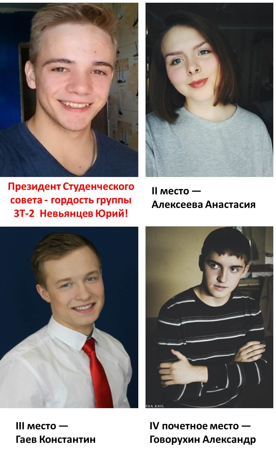 16 сентября в Торгово-экономическом техникуме состоялось историческое событие - Выборы президента Студенческого Совета. В качестве кандидатов на высший студенческий пост выступили 4 кандидата: Алексеева Анастасия Алексеевна (гр. 2Т-2), Говорухин Александр Андреевич (гр. ЗТ-2), Невьянцев Юрий Викторович (гр. 3Т-2) и Гаев Константин (гр. 2Т-1).