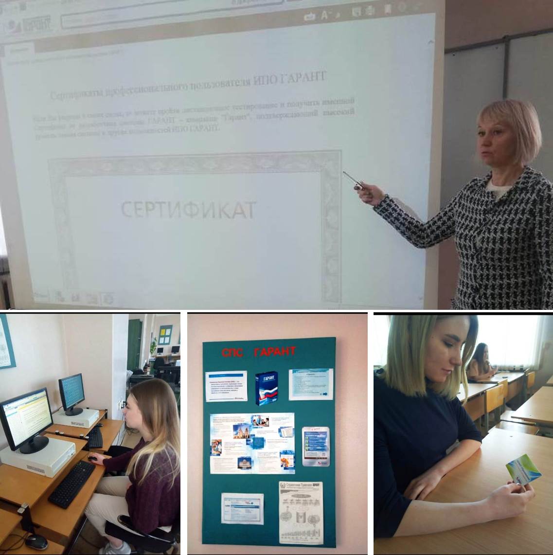 Изучение системы ГАРАНТ осуществляется на дисциплине «Информационные технологии в профессиональной деятельности» для всех специальностей техникума. В этом году участниками семинара и сертификации по системе ГАРАНТ были студенты специальности «Коммерция (по отраслям)». 23 и 24 апреля успешно прошли сертификацию 21 студент из группы 2К-1 и 22 студента из группы 2К-2, и сразу получили карточки с программными кодами для интернет-версии ГАРАНТ. Сертификаты ГАРАНТ подготавливаются и высылаются в течение месяца из головной московской компании ГАРАНТ.