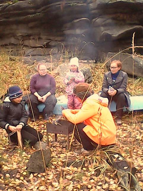 Пообедав, все предались наслаждению природой. Капризная уральская погода решила измениться к лучшему и радовать нас солнцем. Студенты вспомнили детство и кидались шишками. Маленькие члены похода пытались поймать падающие березовые листья и загадать желания. А преподаватели наслаждались тишиной.