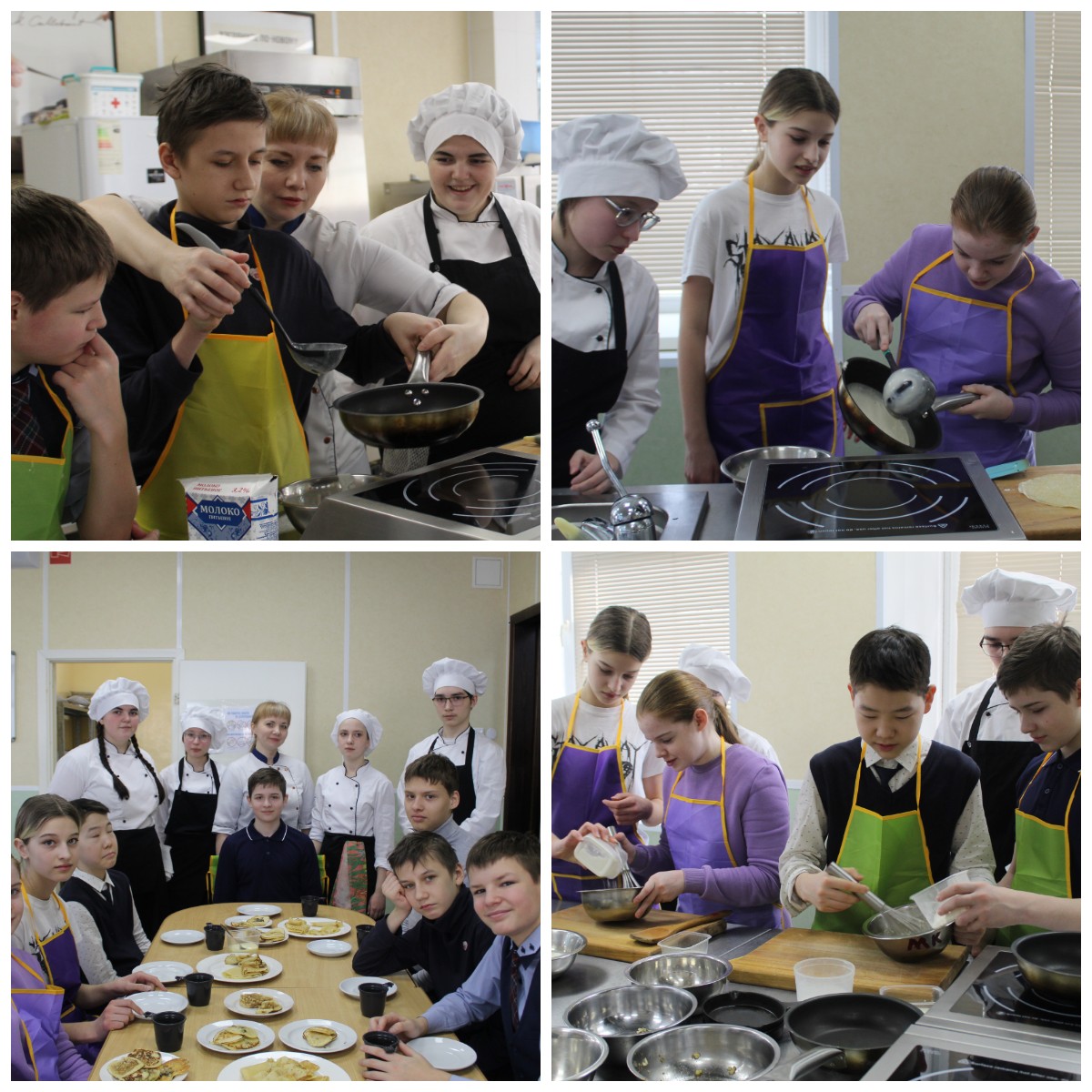 Наши преподаватели Гордеева Н.С. и Кусакина В.Н. показали школьникам как замешивать тесто на традиционные блины и как готовить блины с припеком.