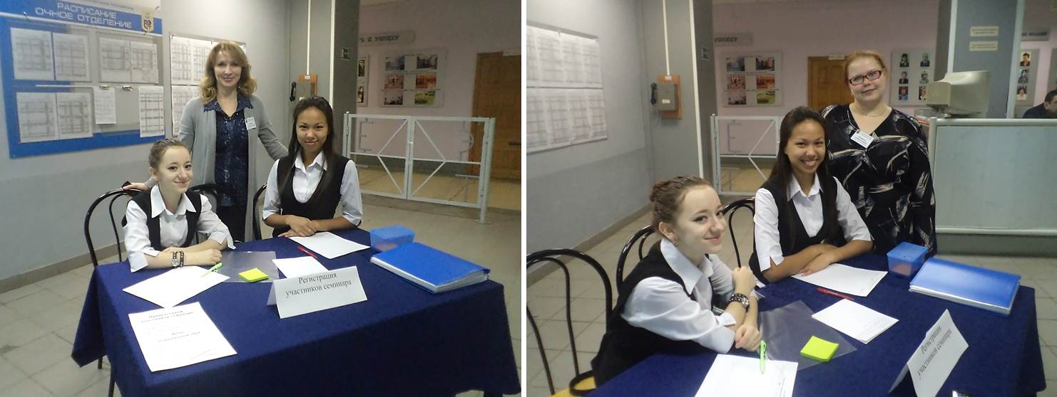 Гостей семинара встречали студенты группы 2РС (Ибрагимова Инга и Гаврилова Ксения), заведующий заочным отделением ЕТЭТ Лукьянова Светлана Юрьевна и методист Петровских Любовь Игоревна.