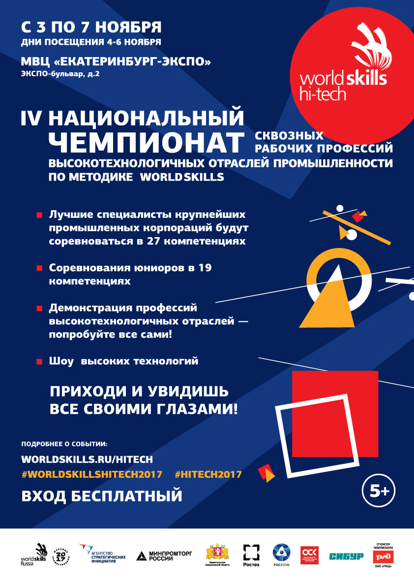 С 4 по 6 ноября в Свердловской области пройдет самое масштабное в России соревнование профессионального мастерства среди крупнейших российских компаний – IV национальный чемпионат сквозных рабочих профессий высокотехнологичных отраслей промышленности по методике WorldSkills. В чемпионате примут участие представители более 300 компаний и госкорпораций, в числе которых Ростех, Росатом, Роскосмос, ООО «Евразхолдинг», ПАО «ОАК», ОАО «ЧТПЗ», ПАО «Сибур Холдинг» и многие другие. Молодые специалисты будут соревноваться в 27 компетенциях.